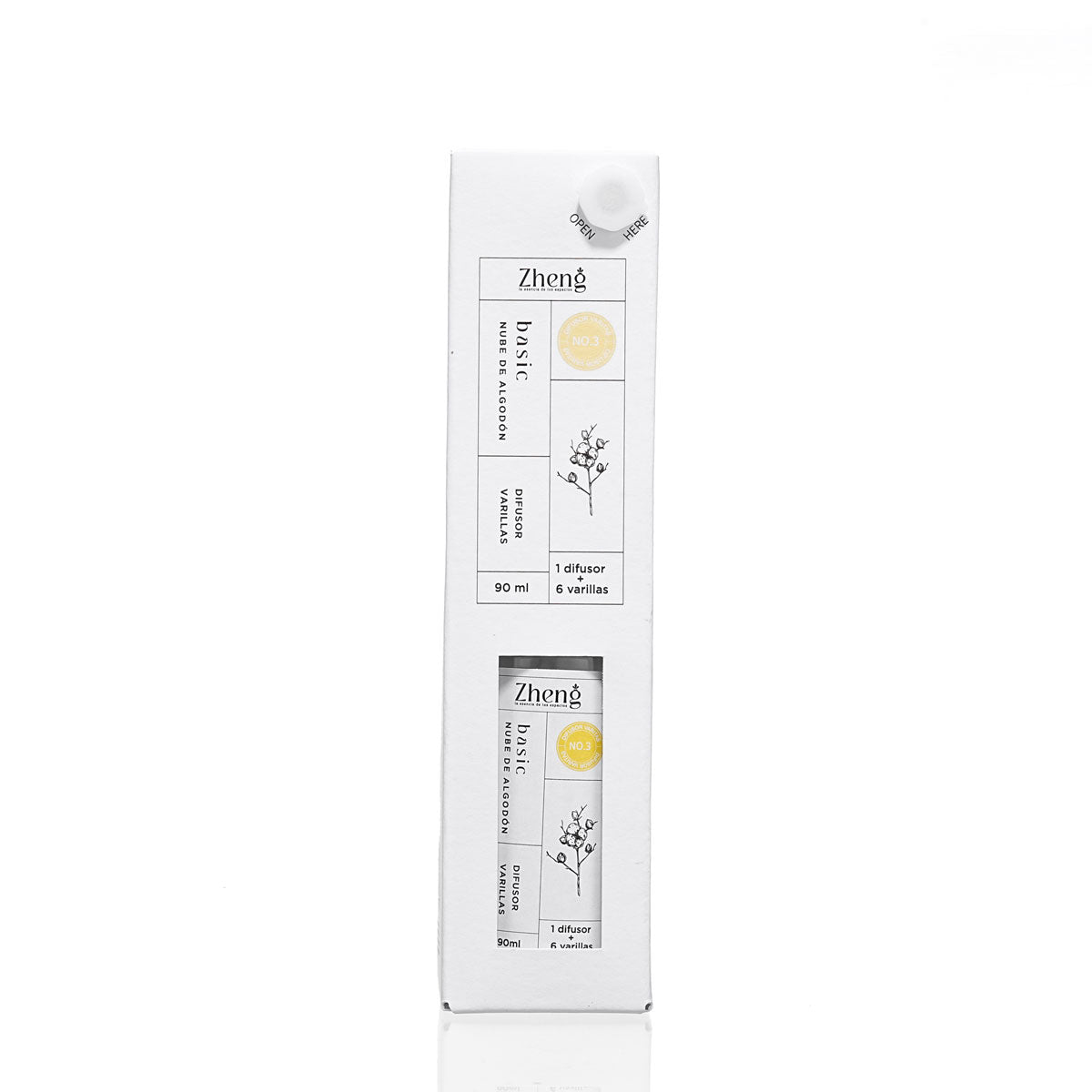 El Difusor Zheng Basic Nube de Algodón perfuma tus espacios con un aroma suave, limpio y reconfortante que evoca la sensación de ropa recién lavada. Con sus 6 varillas y su práctico formato de 90 ml, libera fragancia de manera constante y equilibrada.